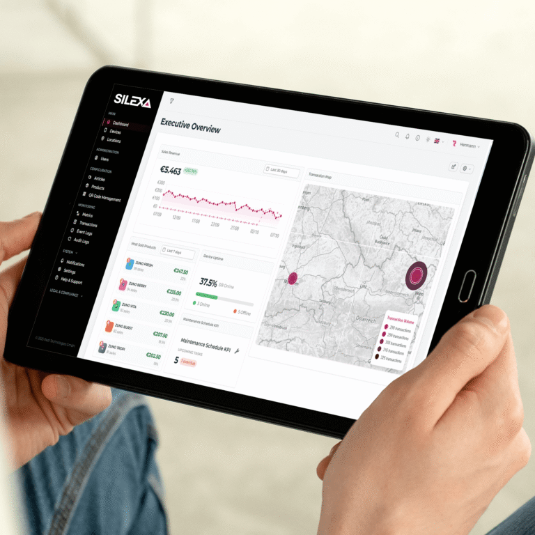 Die SILEXA Cloud Services sind das digitale Rückgrat deines Betriebs. Alle verbundenen Systeme senden in Echtzeit Informationen zu Verbrauch, Umsatz und Wartungszustand – sicher und DSGVO-konform. Über das zentrale Dashboard lassen sich Trends erkennen, Prozesse optimieren und Kosten senken. Kurz gesagt: Deine Daten arbeiten endlich für dich.